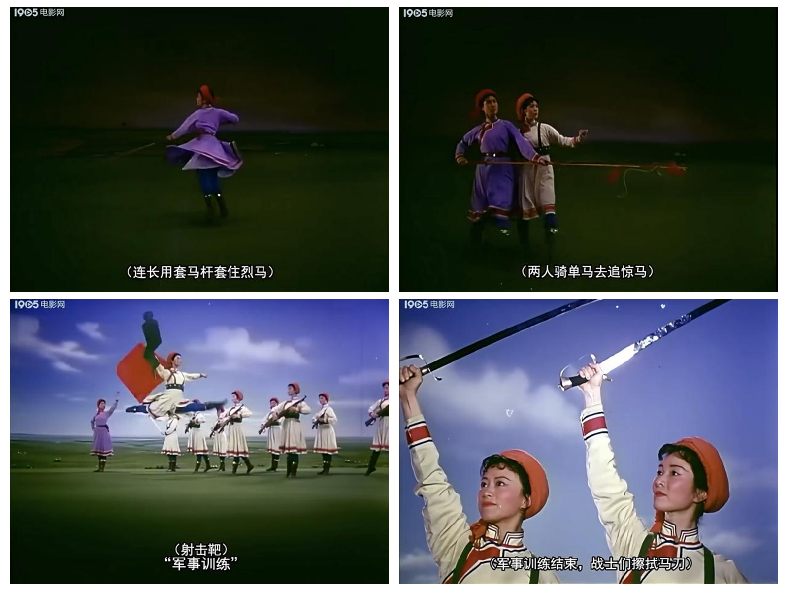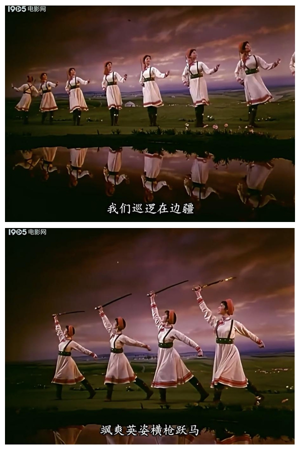 《草原女民兵》最初作為舞臺舞蹈,其美學(xué)特質(zhì)建立在現(xiàn)場性、即時性與三維空間性之上。而當(dāng)它通過《百花爭艷》的鏡頭被重新詮釋時,經(jīng)歷了一場深刻的美學(xué)轉(zhuǎn)換。電影不僅記錄了這一舞蹈,更通過其特有的語言系統(tǒng),對舞蹈進行了二次創(chuàng)作與美學(xué)升華。