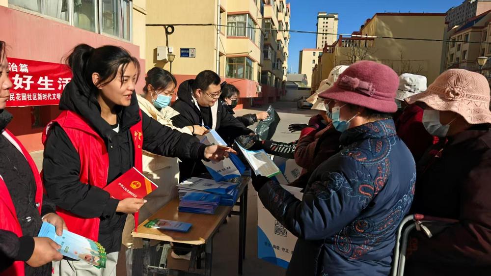 工作人員在社區(qū)內開展普法宣傳活動,向居民發(fā)放法律宣傳資料。