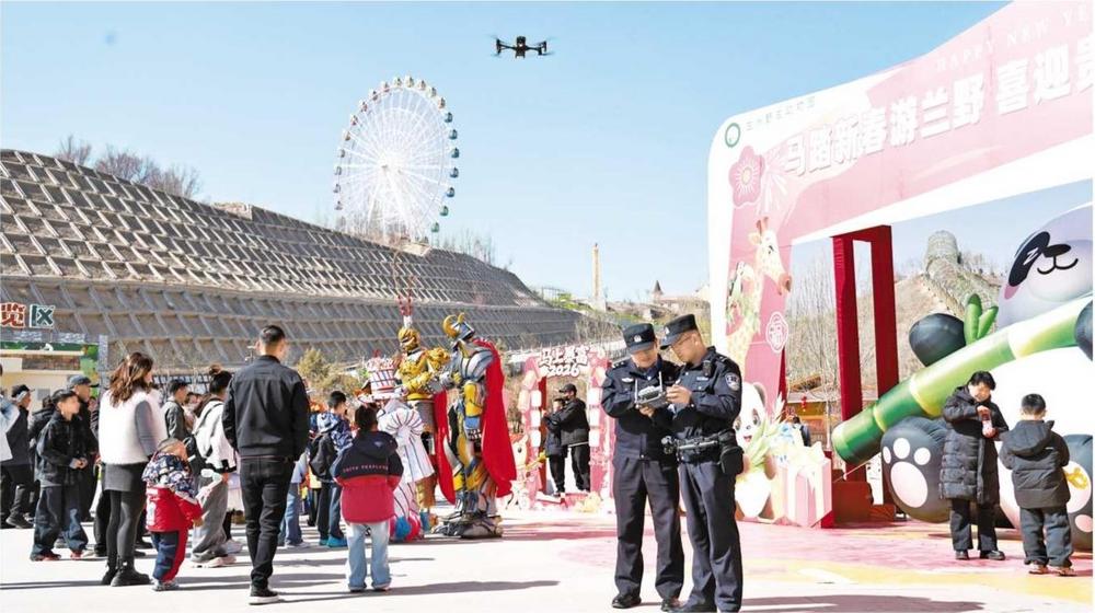 春節(jié)假期,蘭州市公安局安寧分局民輔警在景區(qū)護航游客安心游玩。新甘肅·甘肅法治報通訊員 張軍揚 攝