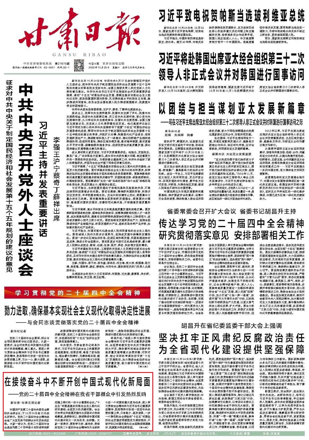 中國共產(chǎn)黨第二十屆中央委員會第四次全體會議,于10月20日至23日在北京舉行。黨的二十屆四中全會精神在全省廣大黨員和干部群眾中引發(fā)熱烈反響。大家一致認為,黨的二十屆四中全會是在向第二個百年奮斗目標進軍的新征程上舉行的一次十分重要的會議。“十五五”時期是基本實現(xiàn)社會主義現(xiàn)代化夯實基礎(chǔ)、全面發(fā)力的關(guān)鍵時期。全會對未來五年我國發(fā)展作出頂層設(shè)計和戰(zhàn)略擘畫,是乘勢而上、接續(xù)推進中國式現(xiàn)代化建設(shè)的又一次總動員、總部署。大家一致表示,要把學習好、宣傳好、貫徹好黨的二十屆四中全會精神作為當前和今后一個時期的重大政治任務(wù),深入學習貫徹全會精神和習近平總書記重要講話精神,把思想和行動統(tǒng)一到黨中央決策部署上來,只爭朝夕、奮發(fā)進取,一步一個腳印把全會描繪的“十五五”時期經(jīng)濟社會發(fā)展宏偉藍圖變?yōu)槊篮矛F(xiàn)實,不斷開創(chuàng)以中國式現(xiàn)代化全面推進強國建設(shè)、民族復興偉業(yè)新局面。