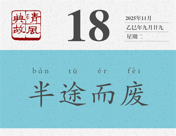 “半途而廢”語(yǔ)出《中庸》:“君子遵道而行,半途而廢,吾弗能已矣。”這句話是孔子說(shuō)的:“君子遵循正道而行,但往往半途而廢,我絕不會(huì)停止的。”