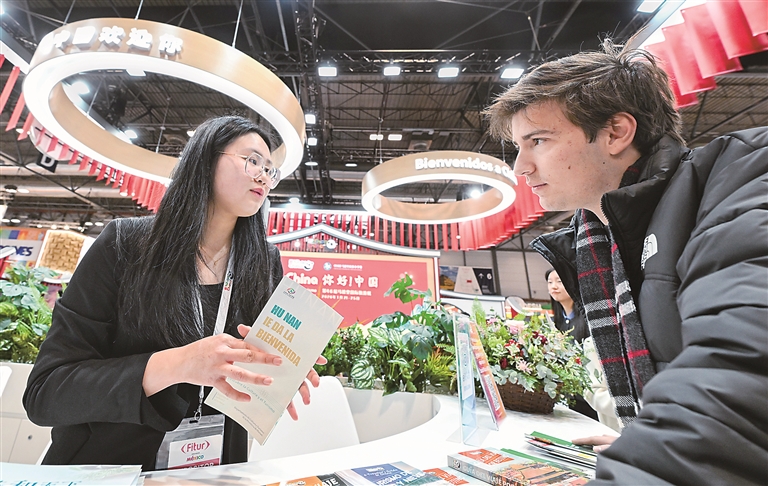 近年來,過境免簽政策持續(xù)擴(kuò)容、免稅購(gòu)物政策不斷優(yōu)化、“即買即退”適用商店持續(xù)增加……得益于中國(guó)日益開放的舉措,越來越多外國(guó)游客在中國(guó)旅游、購(gòu)物,感受更加開放包容、多元?jiǎng)?chuàng)新的中國(guó)。圖為1月21日至25日舉行的馬德里國(guó)際旅游展上,參觀者在中國(guó)展臺(tái)咨詢。新華社記者 程敏 攝