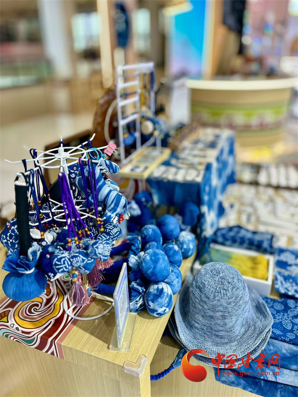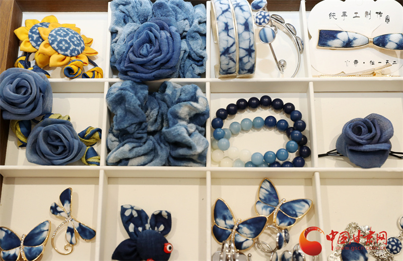 染好的布匹還要經過脫漿、清洗、陰干,最后才是拆線、整理。當一塊完整的藍印花布展現(xiàn)在眼前時,李梅總會輕輕撫摸布料,仿佛在與草木對話。她的工作室里,掛滿了用藍染制成的物件:桌布上印著成片的板藍根葉,茶席邊緣綴著小巧的藍染布扣,就連她日常穿的棉麻衫,也是自己染的淡藍色。“這些布不是冰冷的商品,是帶著土地溫度的生活。”李梅說,去年她在平涼古城開了一間“藍染生活館”,游客可以跟著她學種板藍根、體驗扎染,很多人第一次發(fā)現(xiàn),原來衣服上的藍色可以來自田野,非遺技藝能如此貼近日常。