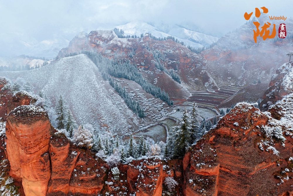 如斧劈刀削的赤壁,被冬雪溫柔地描摹,無(wú)垠的丹霞赤紅與素潔的白雪同框,赭紅似血、潔白如絮,在大地上展開(kāi)一幅對(duì)比強(qiáng)烈又和諧共存的絢麗畫(huà)卷。