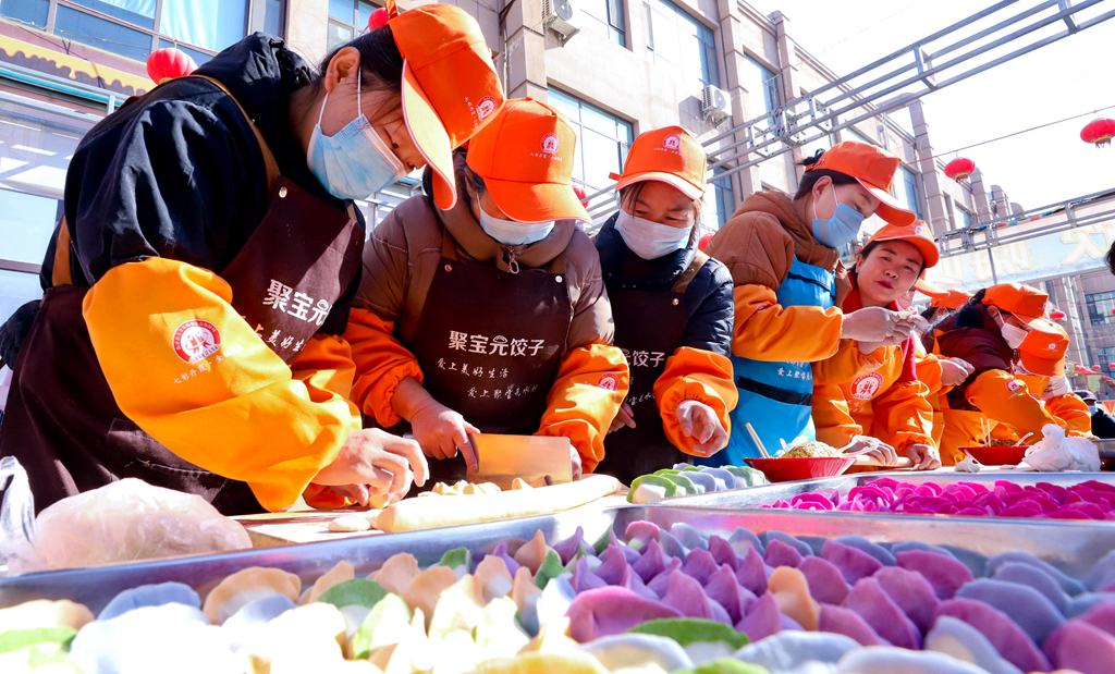 3月5日,臨澤縣金澤廣場美食創(chuàng)意展示大賽現(xiàn)場,農(nóng)家巧廚娘在進(jìn)行“七彩水餃”制作比賽。