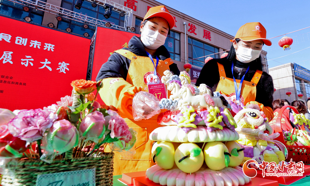 3月5日,臨澤縣金澤廣場美食創(chuàng)意展示大賽現(xiàn)場,農(nóng)家巧廚娘在展示“八駿風(fēng)馳”特色花饃。