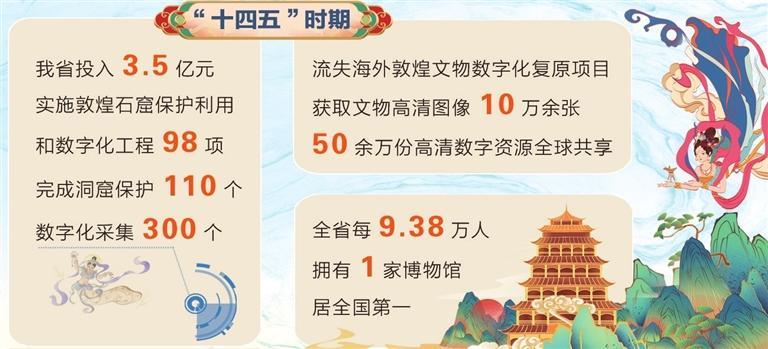 在文物保護提質(zhì)升級方面,我省投入3.5億元,實施敦煌石窟保護利用和數(shù)字化工程98項,完成洞窟保護110個、數(shù)字化采集300個,建成全球首個文物保護多場耦合實驗室,制定國家和行業(yè)標準27項,科研成果服務(wù)16省市及部分共建“一帶一路”國家;流失海外敦煌文物數(shù)字化復(fù)原項目獲取文物高清圖像10萬余張,50余萬份高清數(shù)字資源全球共享;第四次全國文物普查新發(fā)現(xiàn)線索4659條,投入24.26億元實施900余項重要文保項目;打造河西走廊國家遺產(chǎn)線路,創(chuàng)建嘉峪關(guān)長城國家文物保護利用示范區(qū),全省文物系統(tǒng)性保護成效顯著,“中國特色?敦煌經(jīng)驗”國際影響力持續(xù)提升。
