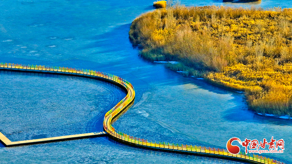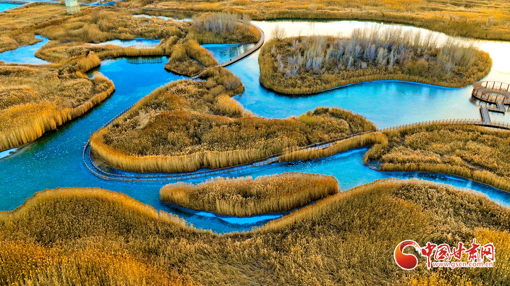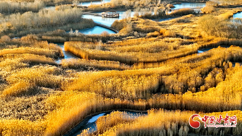 12月4日,張掖市黑河濕地國家級自然保護區(qū)內,經風霜浸染的蘆葦與蒲草披上金裝。從高空俯瞰,夕陽下的蘆葦蕩如金色海洋,蘆花隨風輕舞,碧水凝冰環(huán)繞其間,宛如一幅鋪展的濕地金畫卷,吸引眾多游客與攝影愛好者前來觀賞拍攝。