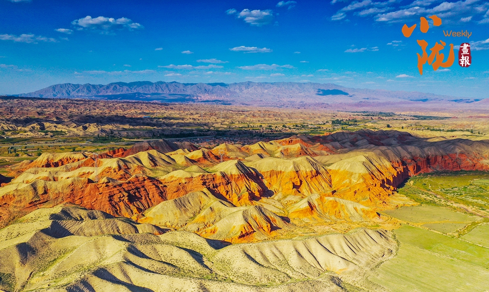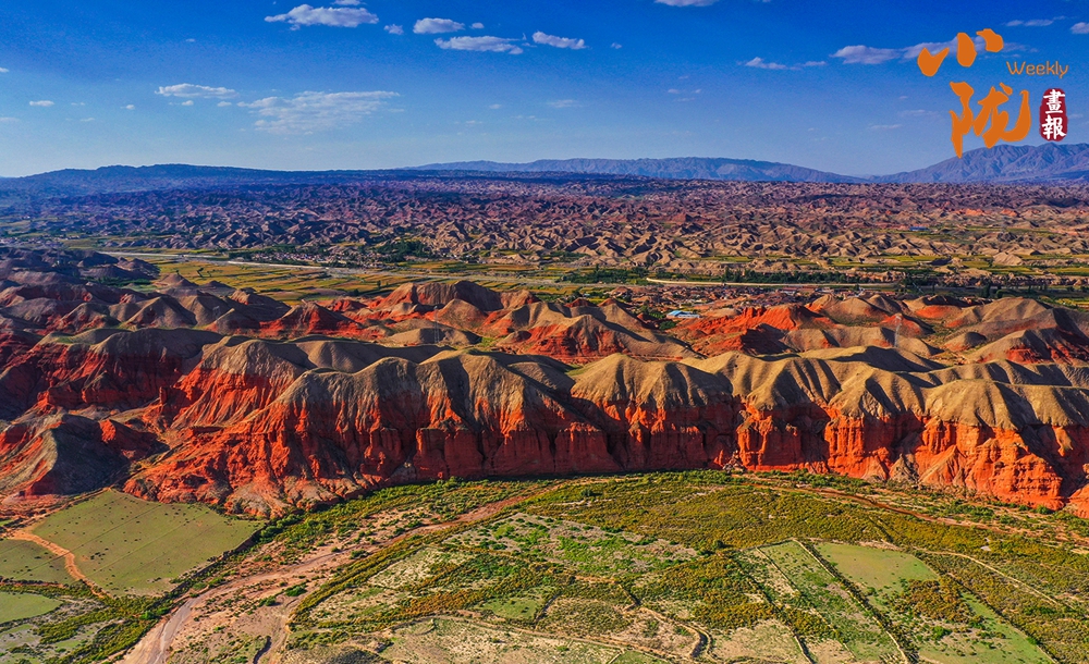 極目遠眺,丹霞丘陵在廣袤的黃土高原上奔騰不息,猶如一座座火焰山。朱砂紅如烈焰燃燒,赭石黃似大地厚土,青黛綠若幽谷深潭,間或夾雜著沉穩(wěn)的灰褐,共同編織出一種難以言喻的斑斕與和諧。