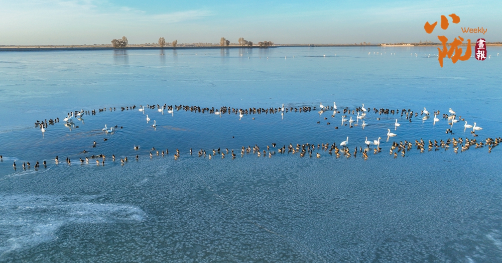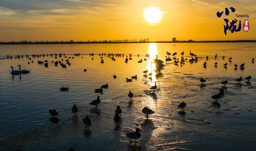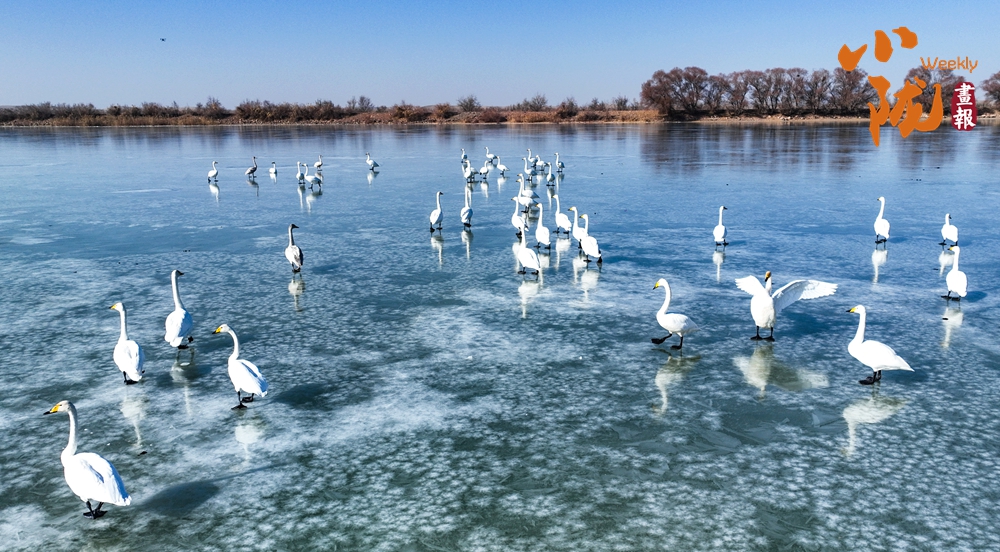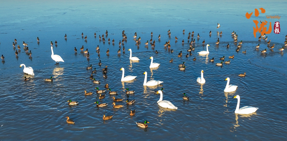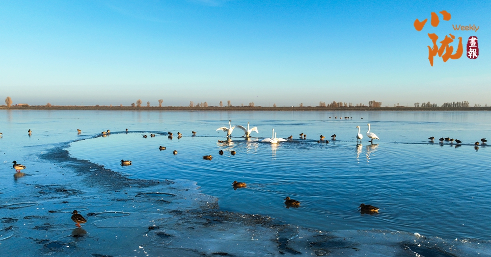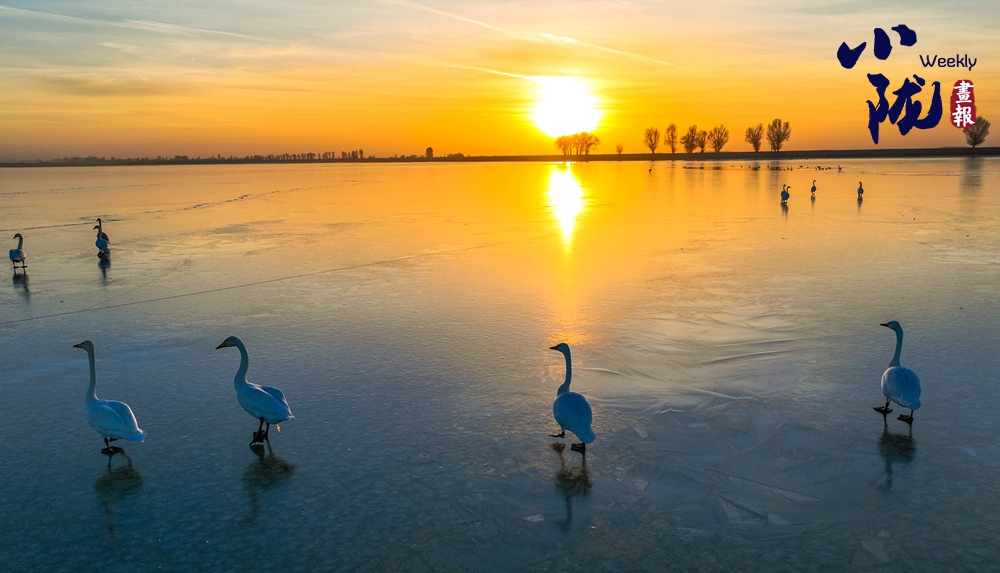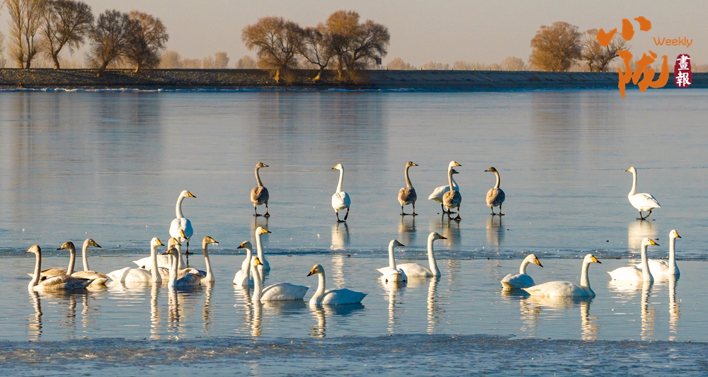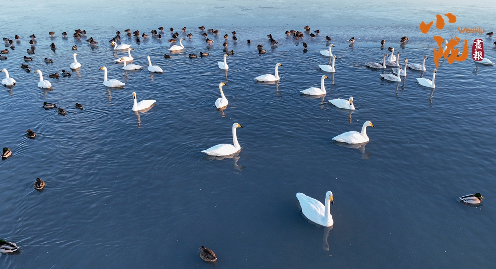 陽(yáng)光斜照,萬(wàn)物生暖。水面上,成群的白天鵝不緊不慢地游著,雪白的身影倒映水中,隨著微波輕輕蕩漾,像是一幅流動(dòng)的水墨畫,素雅而安寧。
