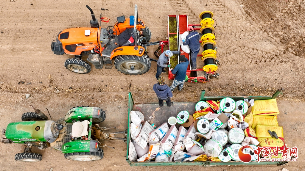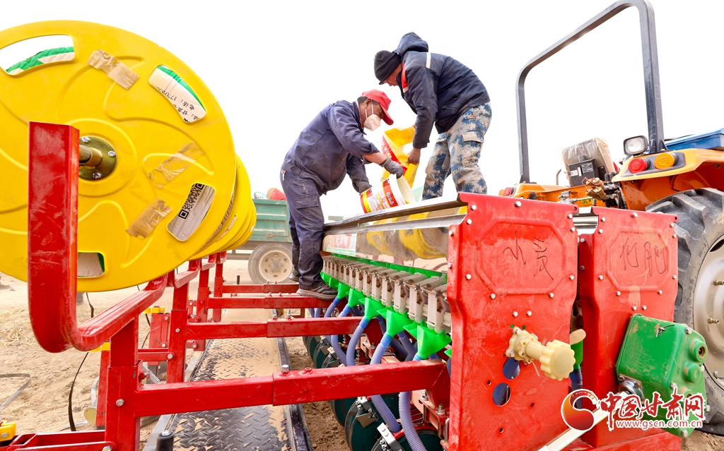 3月12日,張掖市高臺(tái)縣巷道鎮(zhèn)殷家橋村綠色高效小麥種植基地上,農(nóng)戶們正在將小麥種子、有機(jī)肥料投入播種一體機(jī)。
